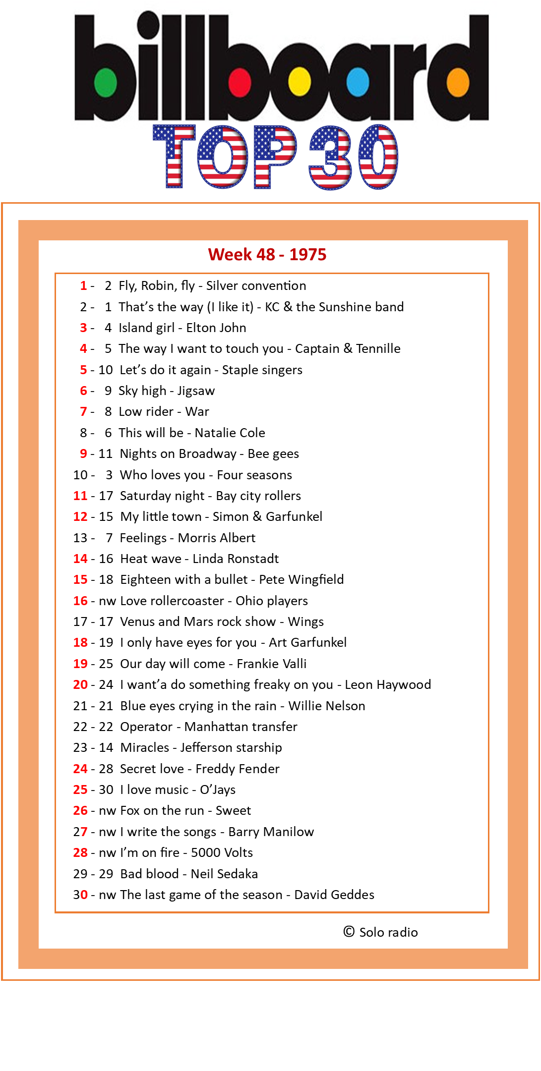 De Billboard Hot 100 is in de Verenigde staten een graadmeter voor de meest geliefde muziek van het moment en biedt een breed scala aan genres en artiesten. Een selectie uit deze Billboard Hot 100 kun je beluisteren op Solo radio.