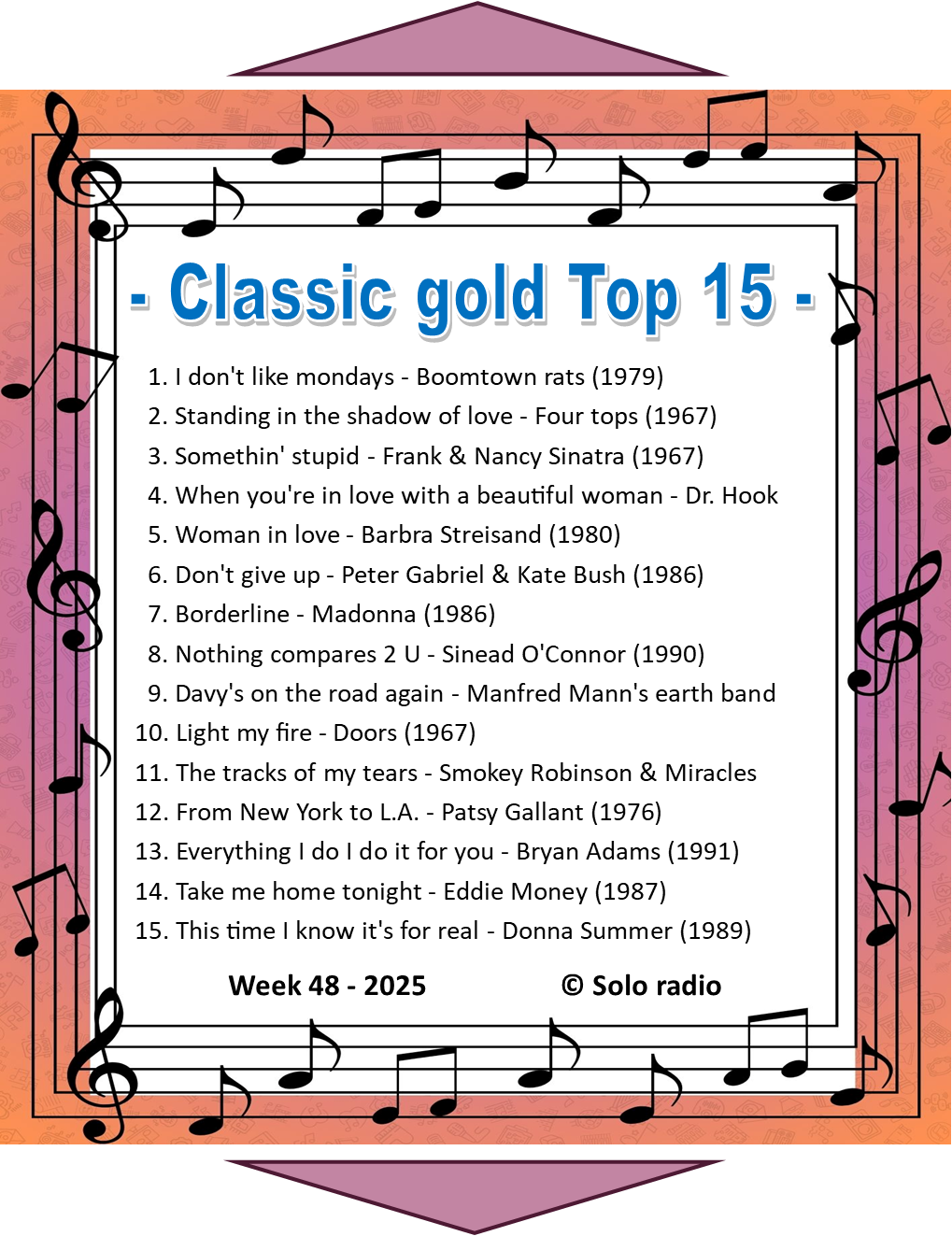 De Classic gold Top 15 wordt iedere vrijdagmorgen om 11 uur uitgezonden op Solo radio.
